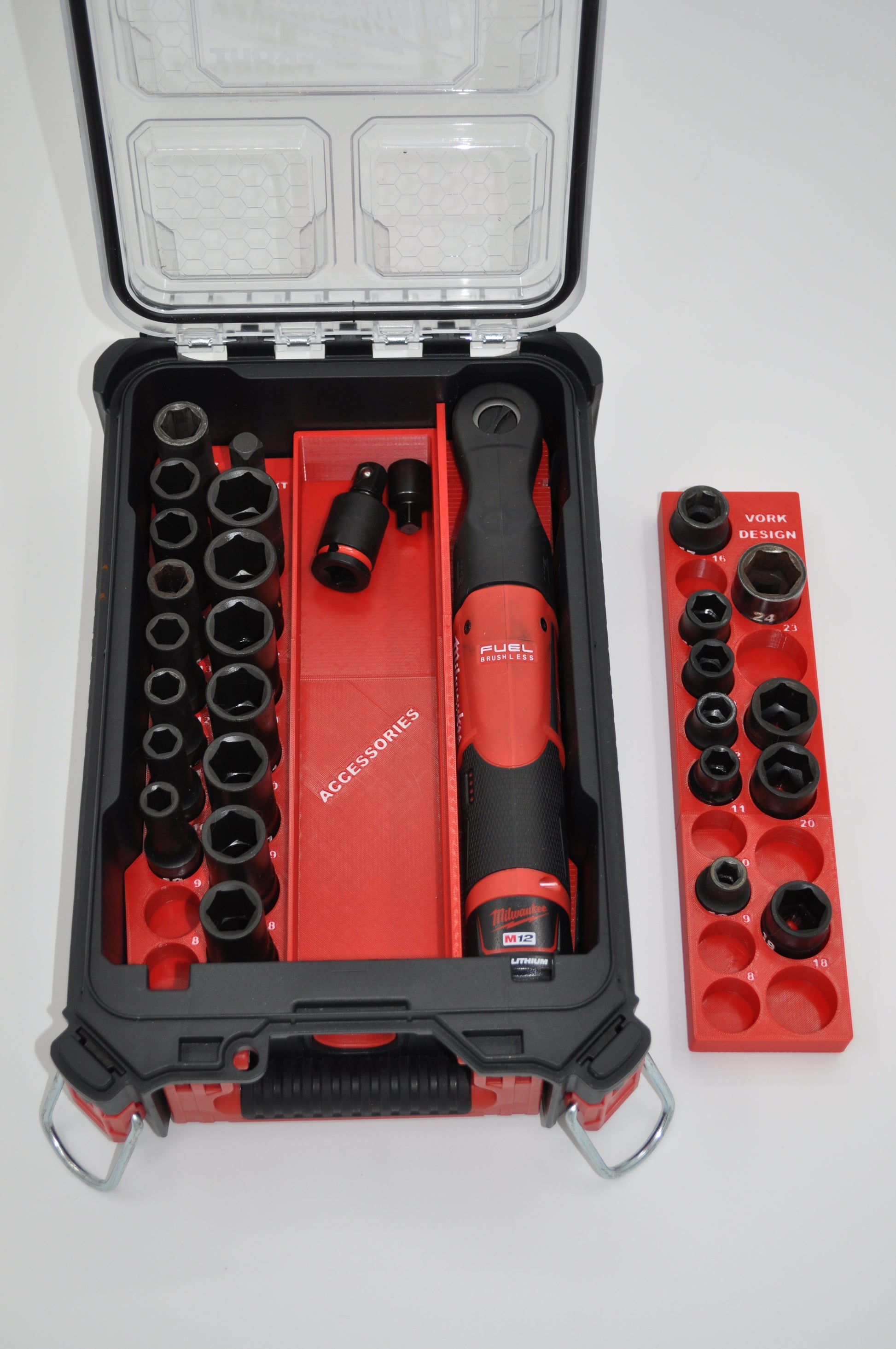 Upgrade je Milwaukee Packout-systeem met deze precisie 3D-geprinte insert, speciaal ontworpen voor de M12 Impact Ratchet 1/2”. Deze insert past perfect in de Milwaukee Packout Deep Organizer (48-22-8435) en houdt je ratchet, sockets en accessoires veilig, strak georganiseerd en direct klaar voor gebruik.
